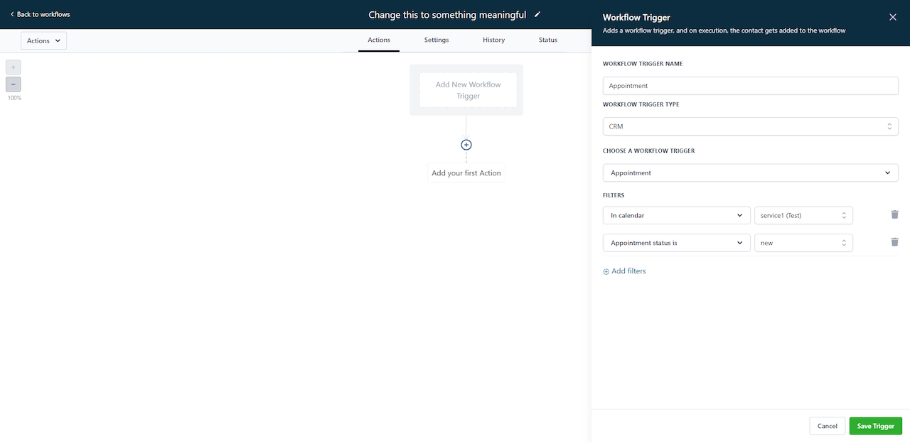 Then, choose the trigger. In this case, I am going to choose "Appointment" with the filters of "In Calendar" and "Appointment Status is" to only trigger off of New appointments on my appt. calendar.